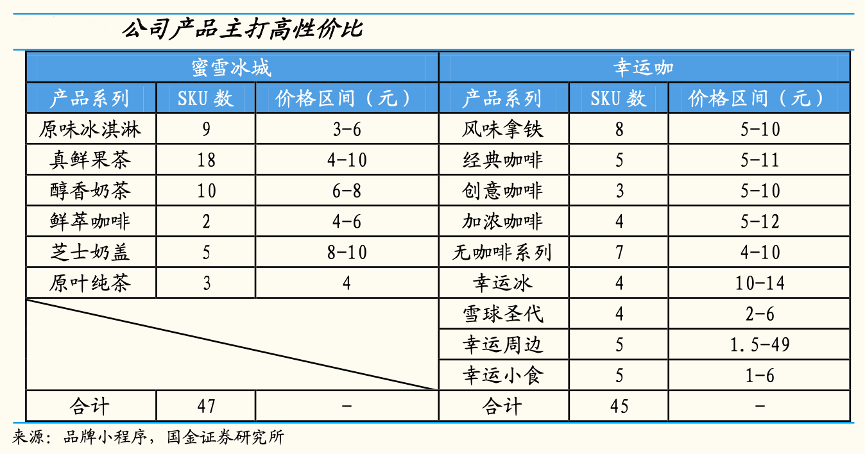 經(jīng)典案例:根據(jù)品牌小程序、國金證券研究所等綜合資訊表明,蜜雪冰城低價高質(zhì)產(chǎn)品受眾廣泛,經(jīng)典單品+定期推新保持菜單吸引力。從蜜雪冰城、幸運(yùn)咖菜單看,產(chǎn)品系列主要有冰淇淋、果茶、奶茶、咖啡四大類,SKU數(shù)在 45 個左右,價格區(qū)間上蜜雪基本在 10 元以下,經(jīng)典冰淇淋僅 3 元,產(chǎn)品性價比高、可選范圍較廣。