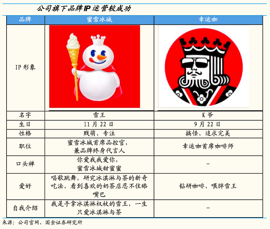 經(jīng)典案例:根據(jù)公司官網(wǎng)、國金證券研究所等綜合資訊表明,蜜雪冰城人格化 IP“雪王”營銷成功,2021年洗腦廣告曲傳播進(jìn)一步推升品牌知名度。從經(jīng)驗看,人格化 IP 的成功塑造有助于形成品牌與消費(fèi)者間的情感鏈接、提升品牌黏性。