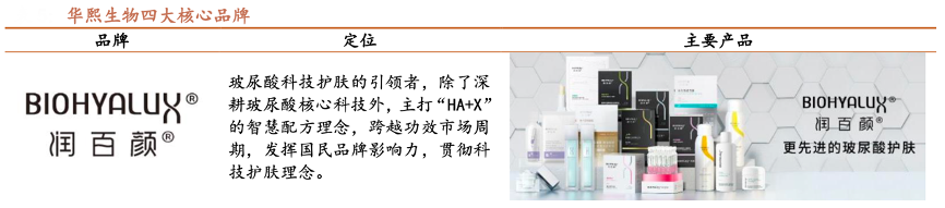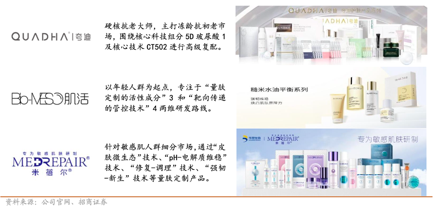 經典案例:根據公司官網、招商證券等綜合資訊表明,華熙生物公司四大核心品牌均已度過起步期,差異化定位日漸清晰。潤百顏定位“透明質酸護膚核心品牌”,深挖玻尿酸 功效,借助“玻尿酸+活性物”打開品牌的廣闊成長空間;夸迪定位“抗衰、抗初老”,主打凍齡抗初老市場,圍繞核心科技組分 5D 玻尿酸 1 及核心技術 CT502 進行高級復配。