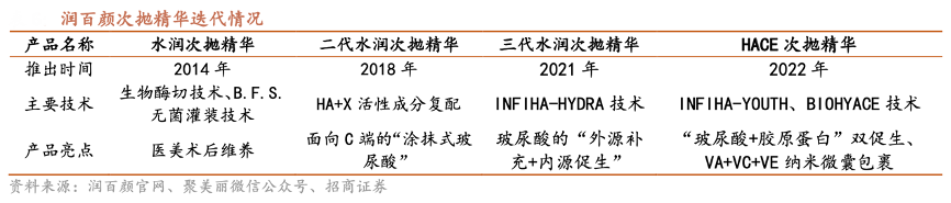 經典案例:根據潤百顏官網、聚美麗微信公眾號、招商證券等綜合資訊表明,2021年,其推出潤百顏第三代次拋精華,運用 INFIHA-HYDRA 技術實現玻尿酸的外源補充+內源促生,該產品也成為潤百顏最具代表性的大單品之一。2022 年,公司憑借 INFIHA-YOUTH 及 BIOHYACE 技術,推出主打“玻尿 酸+膠原蛋白”雙促生和VA+VC+VE 納米微囊包裹的潤百顏 HACE 次拋精華,進一步強化品牌核心的“次拋”特色。