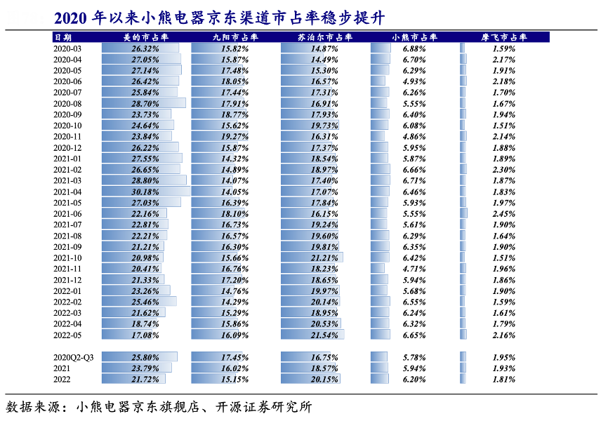 經(jīng)典案例:根據(jù)小熊電器京東旗艦店、開(kāi)源證券研究所等綜合資訊表明,早期小熊電器線上渠道主要分為經(jīng)銷(xiāo)、電商平臺(tái)入倉(cāng)和直銷(xiāo)三種模式,其中經(jīng)銷(xiāo)模 式 2018 年占比 49%,直銷(xiāo)模式占比 9%左右,電商平臺(tái)入倉(cāng)占比32%。直營(yíng)化提升動(dòng)銷(xiāo)管理,結(jié)合魔鏡數(shù)據(jù)顯示,2020年小熊電器渠道體系調(diào)整以來(lái),京東和阿里渠道市場(chǎng)份額穩(wěn)步提升。