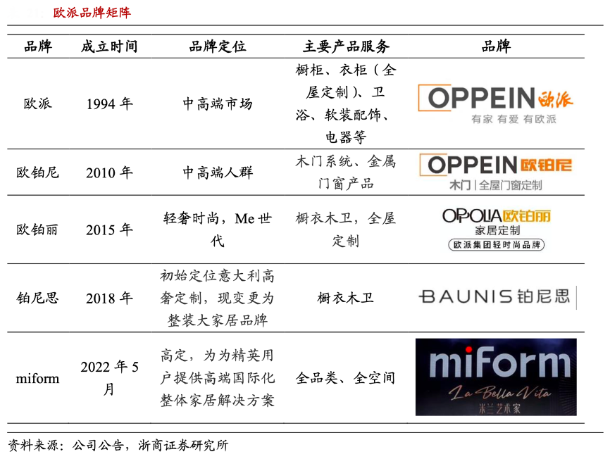 經(jīng)典案例:根據(jù)公司公告、浙商證券研究所等綜合資訊表明,歐派公司擁有歐派、歐鉑尼、歐 鉑麗、鉑尼思等核心品牌,覆蓋中低端、中高端、高端市場。 Miform 是擁有 50 多年歷史的高定家居品牌,以“米蘭藝術(shù)家”為品牌核心理念,致力于打造前沿高端的家居設(shè)計(jì),滿足消費(fèi)者對家居生活美學(xué)藝術(shù)的追 求。
