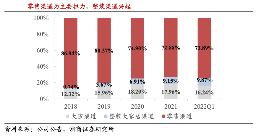 經(jīng)典案例:根據(jù)公司公告、浙商證券研究所等綜合資訊表明,歐派始終將擴(kuò)大訂單數(shù)和市場份額放在第一位,在流量入口的開拓上成效顯著。傳統(tǒng)零售渠道占比從 18 年的 87%下降至 22Q1 的74%, 大宗業(yè)務(wù)渠道 2020 年占比達(dá)到 18%高點(diǎn)后、開始穩(wěn)中有降。2018 年以來,整裝大家居渠 道開始興起,增長快速,占比逐年提升至 10%。