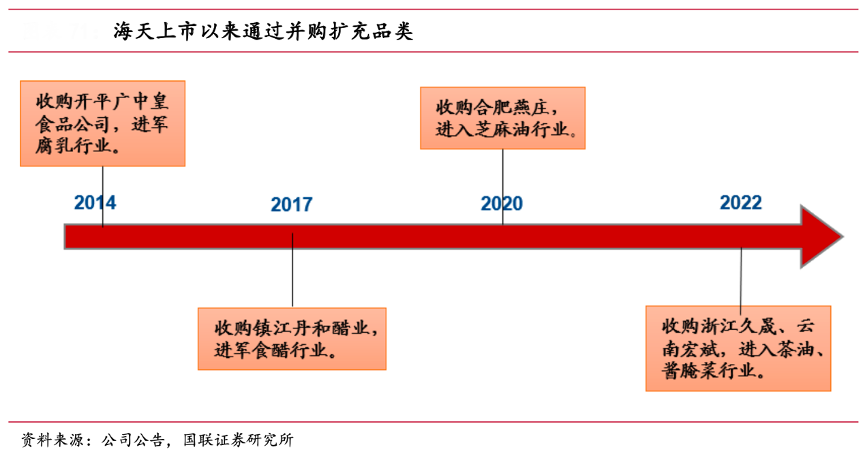 經典案例:根據公司公告、國聯證券研究等綜合資訊表明,海天公司上市后進行五宗并購,從而介入腐乳、食醋、芝麻油、茶油、醬腌菜行業。收購考量一方面是上游原料延伸,一方面投資潛力小品類,補充產品結構。經過多年培育,2022年其上半年醋和料酒增長亮眼,合計規模接近 10 億。
