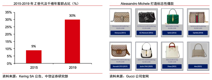 經(jīng)典案例:根據(jù)Kering SA公告、Gucci公司官網(wǎng)、中信證券研究部等綜合資訊表明,Alessandro Michele接任創(chuàng)意總監(jiān)以來,將街頭時(shí)尚注入品牌基因,產(chǎn)品設(shè)計(jì)在尊重品牌經(jīng)典主流設(shè)計(jì)的前提下融合當(dāng)代美學(xué),受到年輕客群的追捧,自接任以來幾乎每年都打造一款標(biāo)志性 爆款,例如 2015 年 Dionysus 酒神包采用標(biāo)志性的雙虎頭馬蹄扣,并在基礎(chǔ)包型之上加入 雙 G 帆布印花、竹節(jié)等品牌經(jīng)典元素。2015-2019 年 Gucci 的客群結(jié)構(gòu)亦發(fā)生了巨大變化,Z 世代及千禧年客戶占比從 9% 大幅提升至 30%,品牌年輕化戰(zhàn)略獲得顯著成效。