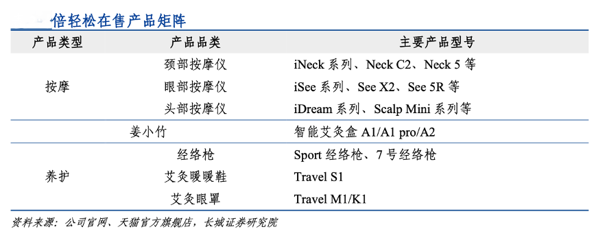 經典案例:根據公司官網、天貓官方旗艦店、長城證券研究院等綜合資訊表明,倍輕松是眼部、頭部按摩儀開創者,其產品堅持“現代科技與古法中醫”的融合,通過高研發投入,不斷提升產品科技感、時尚感和舒適度。2021年公司推出姜小竹系列智能艾灸盒,首次切入理療賽道。2022年5月底,公司首推智能潤眼儀,進一步強化“硬件+耗材”的推新思路,支撐第二曲線增長。