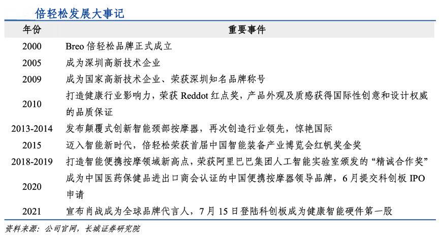 經典案例:根據公司官網、長城證券研究院等綜合資訊表明,倍輕松公司自成立以來便專注于小型便攜智能按摩器具的設計、研發、生產、銷售及服務,不斷推動現代科學技術與傳統中醫理論的有機結合。經過二十余載的耕耘,公司 先后獲得境內外重要獎項十余項,成為中國智能按摩器具行業領軍企業。2021 年 7 月 15 日,公司成功IPO,成為我國健康智能硬件第一股。