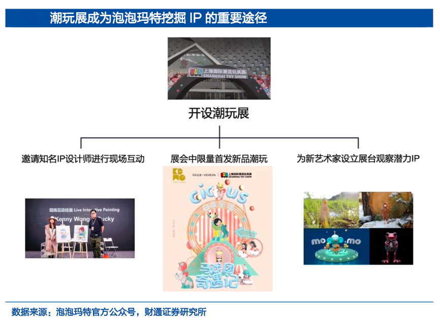 經典案例:根據泡泡瑪特官方公眾號、財通證券研究所等綜合資訊表明,泡泡瑪特公司近年來開設北京潮玩展與上海潮玩展,邀請還未出名的設計師參展,幫助其 定制一批產品并建立展臺。潮玩展每次持續 2 至 3 天,以2019 年 STS 上海國 際潮流玩具展為例,時長 3 天的 STS 吸引 10 萬人次游客觀展。以觀展人次為 基數,公司在展會期間觀察各個設計師展臺的客流量,篩選出吸引較多游客的展 臺,并與設計師進行簽約。