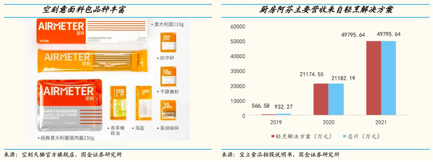 經(jīng)典案例:根據(jù)空刻天貓官方旗艦店、寶立食品招股說明書、國(guó)金證券研究所等綜合資訊表明,寶立食品公司早期是廚房阿芬的調(diào)料包供應(yīng)商,與廚房阿芬合作關(guān)系緊密。2019年11月,廚房阿芬推出新品空刻意面,其中的輕烹料理醬包、歐芹撒粉和蒜香油包均為其提供。2021年廚房阿芬專注輕烹解決方案,其中空刻意面銷量爆發(fā)式增長(zhǎng),推動(dòng)收入翻倍增長(zhǎng)至 5 億元。