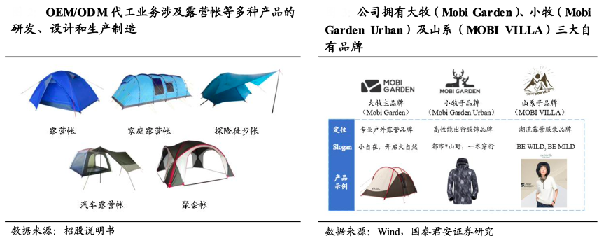 經典案例:根據招股說明書、wind、國泰君安證券研究等綜合資訊表明,牧高笛自成立以來,其在 OEM/ODM 代工業務的基礎上,大力發展自有品牌,陸續推出子品牌 Mobi Garden Urban 和山系輕機能露營服裝子品牌MOBI VILLA,積極提倡國內消費者親近大自然,逐步鞏固在戶外露營領域的龍頭地位。