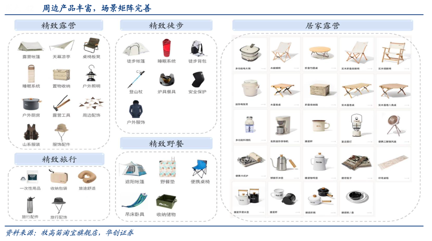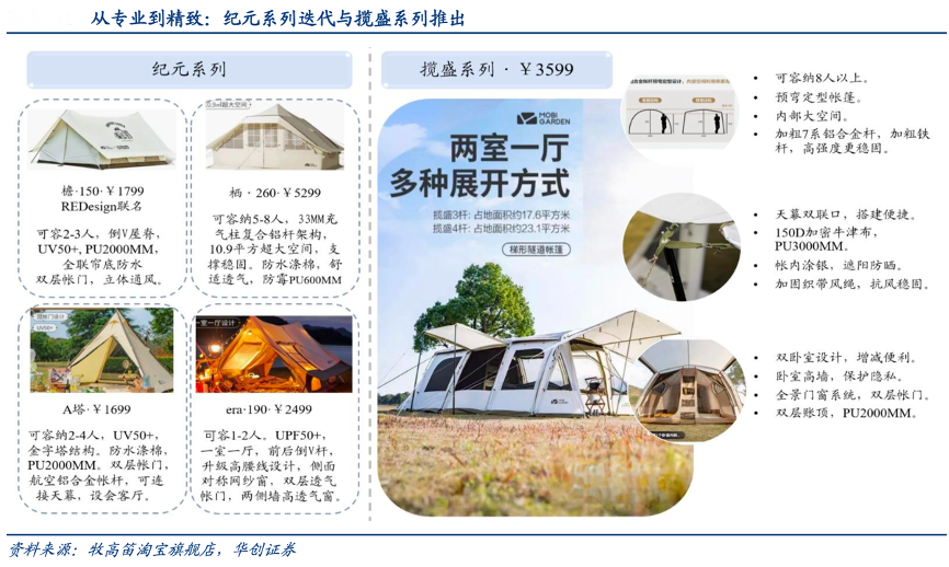 經(jīng)典案例:根據(jù)牧高笛淘寶旗艦店、華創(chuàng)證券等綜合資訊表明,牧高笛2020 年推出“紀 元”系列,定位高端精致露營市場,內(nèi)部空間大幅擴大,契合精致露營場景需求;2021年公司推出“攬盛”梯形隧道帳篷,活動空間更大,上市后始終占據(jù)銷量前列,成為公司另一大爆款產(chǎn)品;顏色方面公司推出純霧白,理念為“用東方色彩裝點東方山水”。