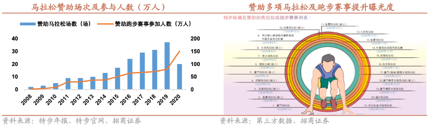 經典案例:根據特步年報、特步官網、第三方數據、招商證券等綜合資訊表明,特步馬拉松賽事贊助強化品牌跑步基因。2008-2019 年期間,贊助馬拉松賽事場次從 2 場增長至 37 場,贊助賽事參與人 數從 1.1 萬人增長至 80 萬人,15 年以來連續蟬聯中國內地贊助最多馬拉松賽事的體育用品贊助商,品牌曝光度提升。