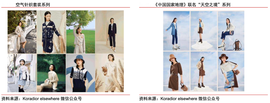 經(jīng)典案例:根據(jù)Koradior elsewhere微信公眾號、中信證券研究部等綜合資訊 表明,2021年珂思空氣針織套裝將“針織梭織化”,打破對針織款式的刻板印象,提升面料的光澤感和挺闊度。聯(lián)名《中國國家地理》,傳達自然舒適理念。2021 年珂思從《中國國家地理》收錄的 風光圖譜汲取靈感,以抽象的藝術(shù)手法將自然之韻榮譽時裝設計,獲得西藏扎布耶茶卡鹽 湖、新疆伊犁霍城縣薩爾布拉克鎮(zhèn)、內(nèi)蒙古黃崗梁圖鑒授權(quán),分別推出“天空之境”“絕美伊犁”“膠囊系列—共生”三大聯(lián)名系列,傳達品牌敬畏自然,堅持可持續(xù)時尚的理念。