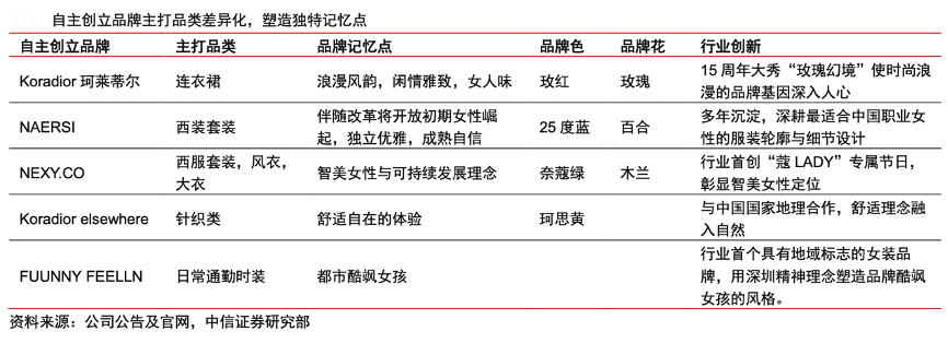 經(jīng)典案例:根據(jù)公司公告及官網(wǎng)、中信證券研究部等綜合資訊表明,贏家時(shí)尚公司從核心品類出發(fā)劃分各品牌定位,打造獨(dú) 特記憶點(diǎn)。以公司自主創(chuàng)立品牌為例,珂萊蒂爾核心定位為閑情雅致,女人味,因此主打品類為最能體現(xiàn)浪漫情調(diào)的連衣裙;娜爾思的創(chuàng)立伴隨改革開(kāi)放初期女性崛起,旨在給女 性提供獨(dú)立優(yōu)雅、成熟自信的盛年服裝,因此主打品類為西服套裝。