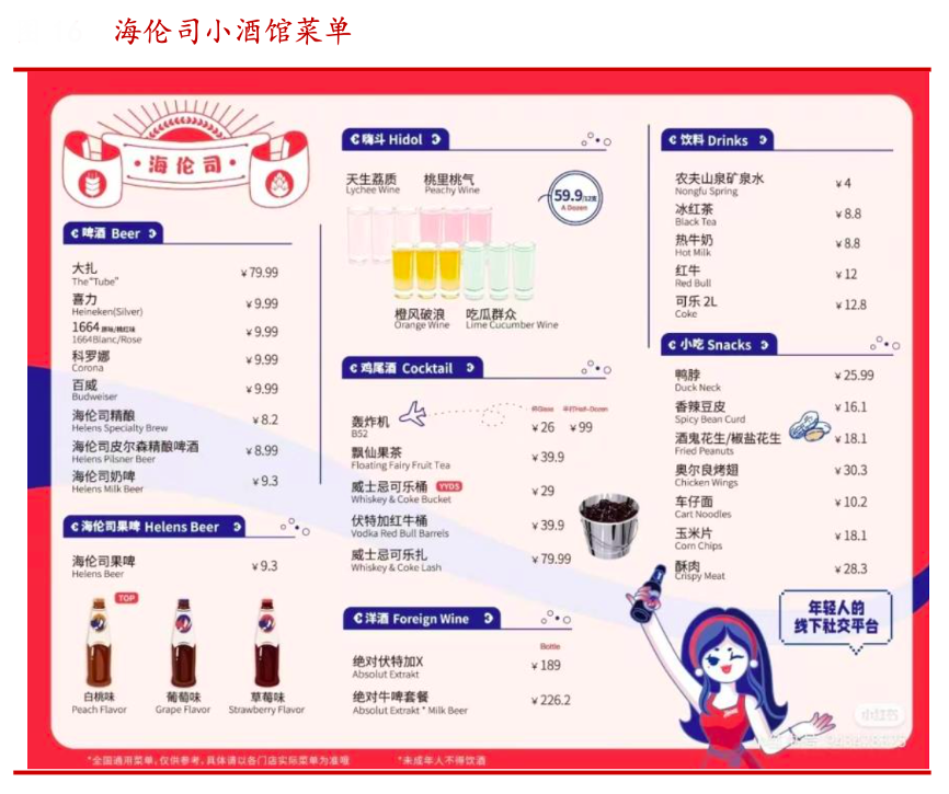 經典案例:根據華西證券研究所等綜合資訊表明,海倫司酒水小食定制化,SKU 打造極致性價比。海倫司小酒館菜單包含四類產品:酒飲、軟飲料、小食與其他產品。(1)單瓶啤酒均不超過 10 元,客單價處于較低水平,具有極致的性價比。根據艾媒咨詢,2021 年我國小酒館消費者消費因素調查的數據顯示,約 48.8%的消費者看重價格,進一步驗證海倫司對年輕客群的吸引力。