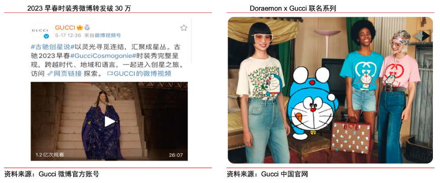 經典案例:根據Gucci微博官方帳號、Gucci中國官網、中信證券研究部等綜合資訊表明,除產品設計年輕化外,Gucci在中國市場,品牌所有營銷大事件都配合微博進行話題流量投放, 2023 早春時裝秀獲多位一線明星轉發,累計播放量超 1.2 億次,轉發量超 30 萬。另一方面品牌積極推進與年輕一代中流行的品牌和 IP 進行聯名活動,包括與巴黎世家、哆啦 A 夢和 Adidas 合作推出聯名產品,其中哆啦 A 夢聯名款在 TikTok 平臺上點贊超過 30 萬,進一步擴大在年輕客群的品牌影響力。