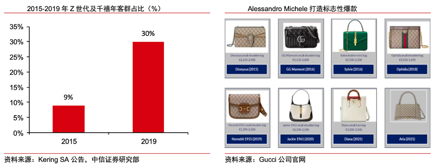 經典案例:根據Kering SA公告、Gucci公司官網、中信證券研究部等綜合資訊表明,Alessandro Michele 接任創意總監以來,將街頭時尚注入品牌基因,產品設計在尊重品牌經典主流設 計的前提下融合當代美學,受到年輕客群的追捧,自接任以來幾乎每年都打造一款標志性爆款,例如 2015 年 Dionysus 酒神包采用標志性的雙虎頭馬蹄扣,并在基礎包型之上加入 雙 G 帆布印花、竹節等品牌經典元素。