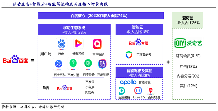 經典案例:根據公司公告、開源證券研究所等綜合資訊表明,百度核心主要提供在線營銷、增值服務以及 AI 驅動的產品及服務,移動生態系統、AI智能云和智能駕駛共同成為百度核心的三級增長曲線,其中的“移動生態系統”由十幾個應用程序組成的組合,包括百度 App、好看和百度貼吧等,通過 AI 構件聚合大量第三方長尾內容和服務,并幫助社區連接和分享信息,借助流量通過搜索和信息流廣告變現。
