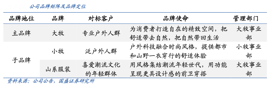 經典案例:根據公司公告、國盛證券研究所等綜合資訊表明,2021年,牧高笛公司對品牌理念進行進一步升級,形成了以“大牧”(Mobi Garden)為主品牌,“小牧”(Mobi Garden Urban)與“山系服裝”(MOBI VILLA)為子品牌的品牌矩,并明確品牌風格和對標客戶,即“大牧”品牌主要提供戶外專業裝備及服裝,“小牧”品牌主要提供多場景穿著。