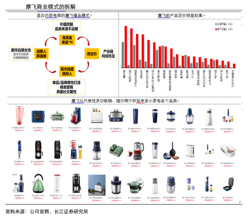 經典案例:根據公司官網、長江證券研究所等綜合資訊表明,摩飛的爆品模式重點在于:精準 SKU 投放背景下產品以大單品、 少 SKU的形式開展;同時內容電商對費用投放的較高要求,摩飛將人群限定在“相對高消費、追求品質生活的女性人群”且產品采用高定價。