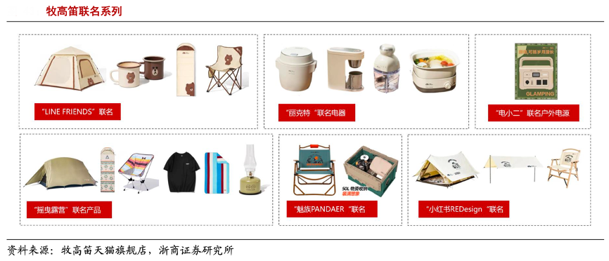 經典案例:根據牧高笛天貓旗艦店、浙商證券研究所等綜合資訊表明,中國露營市場正 從“專業性能”向“時尚精致”轉變,牧高笛公司于 2021 年推出 Line Friends 聯名系列,打破傳統帳篷單調沉悶的形象,瞄準親子、女性、年輕人客群,該聯名系列同時還包括天幕、拖車、睡袋、折疊椅、野餐墊等配套產品,目前已占大牧銷售額約10%。此外,公司還與魅族 PANDAER、搖曳露營、麗克特、電小二、小紅書等與自身品牌調性契合的品牌/IP 聯名推出系列產品,以快速觸及新用戶,提升品牌知名度。