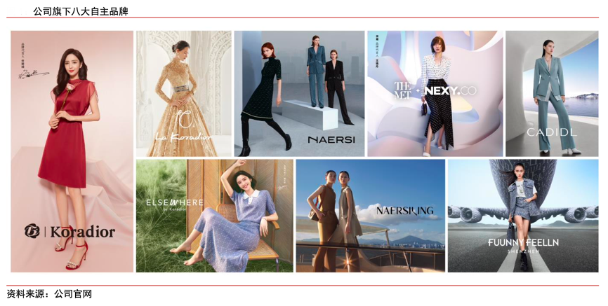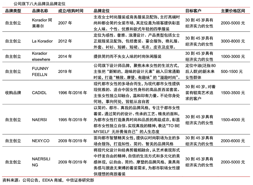 經典案例:根據公司官網、中信證券研究部等綜合資訊表明,贏家時尚目前旗下共八大自主品牌,可分為高端線的 Koradior、La Koradior、Koradior elsewhere、NAERSI、NAERSILING、 NEXY.CO 、CADIDL,以及 2019 年新成立的中端品牌 FUUNNY FEELLN。八大品牌風格定位及產品價格區間亦有差異:其中雙主品牌 Koradior 和NAERSI,以及收購品牌 NEXY.CO 、CADIDL 主要為都市女性提供商務或休閑服飾,主流產品價格區間位于2000 到 5000 元。