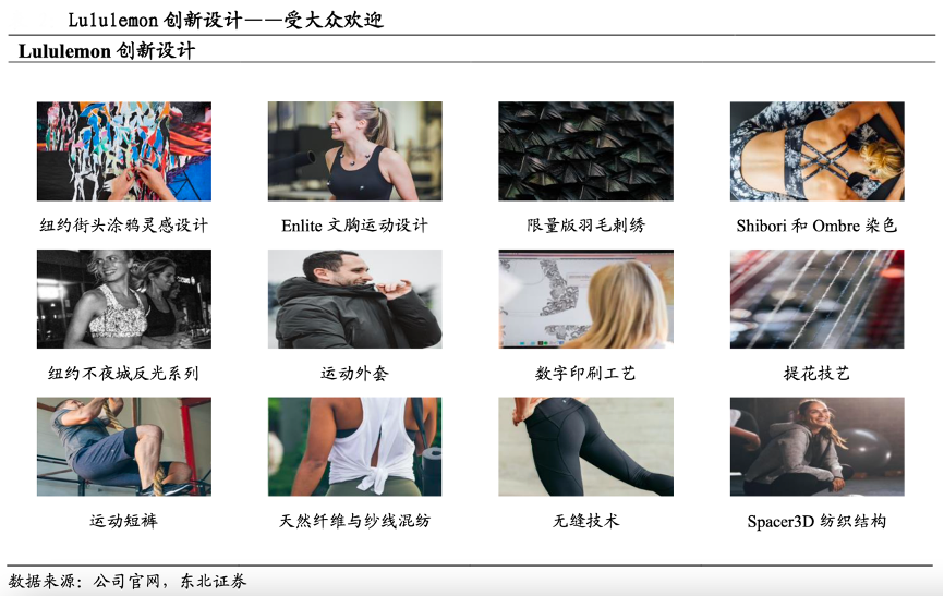 經(jīng)典案例:根據(jù)公司官網(wǎng)、東北證券等綜合資訊表明,Lululemon面料研發(fā)和時(shí)尚創(chuàng)新由研究人員、工程師和專業(yè)設(shè)計(jì)師團(tuán)隊(duì)合作完成,體現(xiàn)“以健康生活方式為靈感”設(shè)計(jì)理念的同時(shí)保證高品質(zhì),團(tuán)隊(duì)根據(jù)市場(chǎng)行情和客戶反饋確定趨勢(shì),尋求在產(chǎn)品功能、風(fēng)格、技術(shù)上實(shí)現(xiàn)靈感突破。