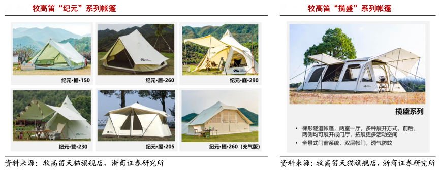 經(jīng)典案例:根據(jù)牧高笛天貓旗艦店、浙商證券研究所等綜合資訊表明,牧高笛公司于 2020 年推出“紀(jì)元”系列,定位高端精致露營市場,相比于傳統(tǒng)戶外帳篷,紀(jì)元系列帳篷內(nèi)部空間大幅擴(kuò)大,高度達(dá)到 1.8-2.9 米,可以展開前廳,使用者可以在帳篷內(nèi)烹飪,契合精致露營場景的獨(dú)特需求。2021年公司推出“攬盛”梯形隧道帳篷,活動(dòng)空間更大且利用率高,上市后始終占據(jù)銷量前列,多次追加補(bǔ)單,成為公司另一大爆款產(chǎn)品。