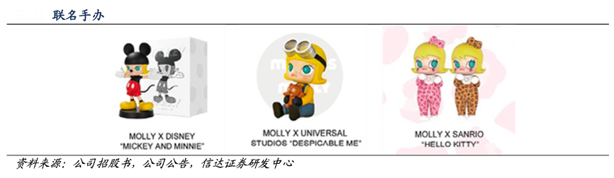 經典案例:根據公司招股書、公司公告、信達證券研發中心等綜合資訊表明,泡泡瑪特與知名 IP 推出聯名手辦,延長 IP 生命周期。公司積極尋求 IP 跨界合作的機會,得以覆蓋 更加廣泛的粉絲群。Molly 曾與 The Monsters、Despicable Me 和 Hello Kitty 等世界知名 IP 聯名推出手辦產品,粉絲群的不斷拓張令 IP 生命周期得以延長。
