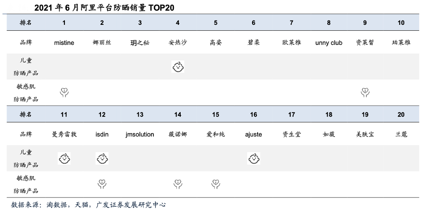 經(jīng)典案例:根據(jù)淘數(shù)據(jù)、玥之秘天貓旗艦店、廣發(fā)證券發(fā)展研究中心等綜合資訊表明,兒童和敏感肌人群是防曬新品布局的主要方向。2021年6月阿里平臺防曬銷量TOP20中,4個品牌率先推出兒童防曬產(chǎn)品,分別為安熱沙、曼秀雷敦、isdin和ajuste;5個品牌擁有敏感肌專屬防曬產(chǎn)品,分別為 mistine、資萊皙、isdin、薇諾娜和愛和純。兩類人群對于防曬產(chǎn)品都有共同的要求——高安全性。這不僅要求選用兼具高防護(hù)力和高安全性的防曬劑原料,也考驗(yàn)品牌的配方能力,擁有安全配方基礎(chǔ)的品牌和公司占據(jù)優(yōu)勢。