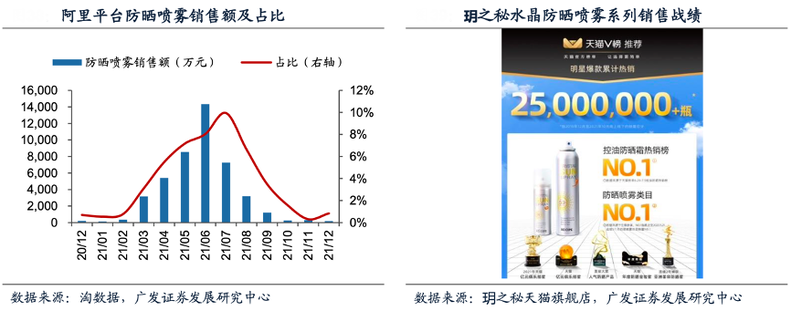 經(jīng)典案例:根據(jù)淘數(shù)據(jù)、天貓、廣發(fā)證券發(fā)展研究中心等綜合資訊表明,防曬噴霧質(zhì)地清爽、使用方便且適合補(bǔ)涂的特點(diǎn),使其在夏季的表現(xiàn)尤其亮眼。根據(jù)淘數(shù)據(jù),2021年阿里平臺防曬噴霧銷售額高達(dá)4.44億元,占防曬品類的5.40%。 在防曬高峰期5-7月,防曬噴霧的銷售占比均突破7%,玥之秘、高姿及資萊皙品牌旗下的防曬噴霧入圍2021年6月天貓防曬銷量TOP10榜單。