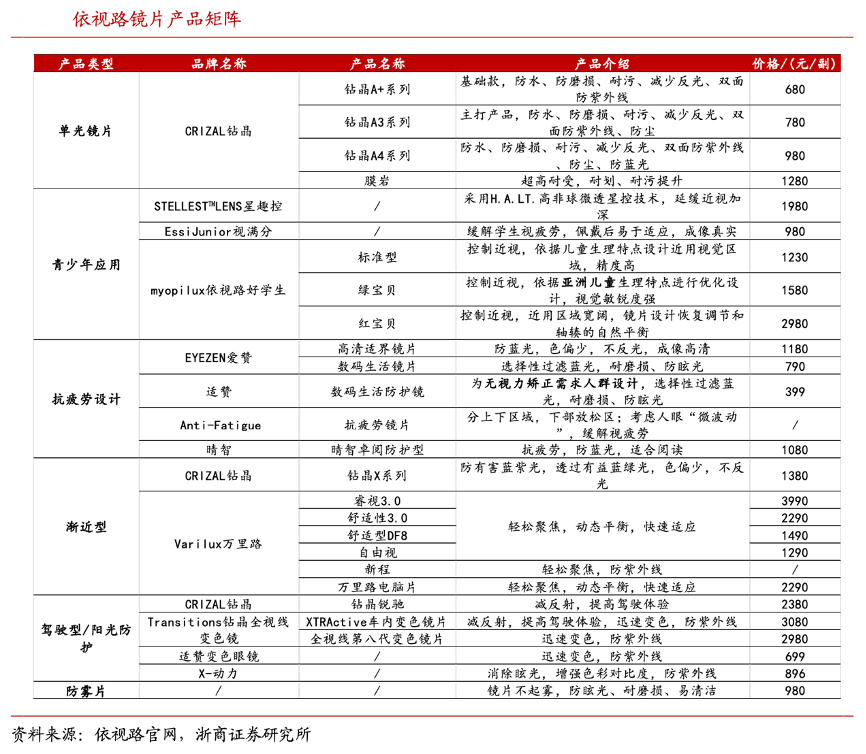 經(jīng)典案例:根據(jù)公司官網(wǎng)、浙商證券研究所等綜合資訊表明,2021 年 7 月,明月鏡片公司聯(lián)合中國工程院莊松林院士團隊共同推出采用周邊離焦技術的青少年近視防控鏡片“輕松控”,價格定位1598-2598元,2021年底,公司進一步推出采用多點離焦技術的近視防控鏡片“輕松控Pro”,顯現(xiàn)出公司的研發(fā)和產(chǎn)品技術迭代能力,價格帶亦有上移(2298-2998元)。