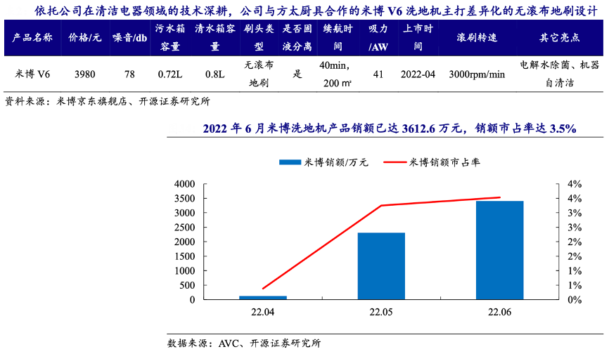 經典案例:根據米博京東旗艦店、AVC、開源證券研究所等綜合資訊表明,順造科技公司依托深耕清潔電器ODM 業務的研發制造端優勢,2022年其以 ODM 方式與方太廚具合作,推出米博 V6 洗地機,針對傳統拖布易發臭的痛點,主打差異化的無滾布地刷設計,通過每分鐘高達 3000 次的擦地實現了高效的地面清潔效果。