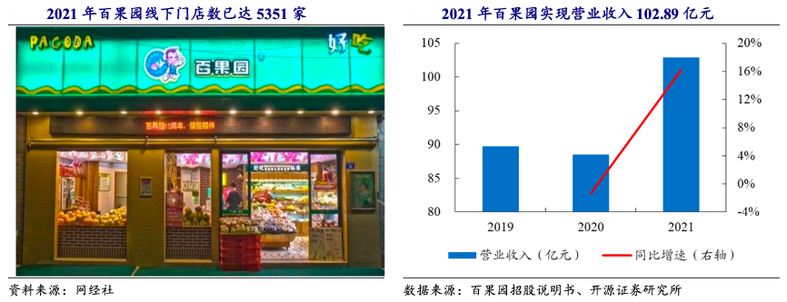 經(jīng)典案例:根據(jù)網(wǎng)經(jīng)社、百果園招股說明書、開源證券研究所等綜合資訊表明,百果園是我國領(lǐng)先的水果新零售企 業(yè),擁有業(yè)內(nèi)最大的水果分銷網(wǎng)絡(luò),截至 2021 年底線下門店數(shù)量達(dá) 5351 家,遍布我國 22 個省和超過 130 個城市;2021 年實(shí)現(xiàn)營業(yè)收入 102.89 億元,其中 99.92 億元 為以水果為主的生鮮銷售業(yè)務(wù),實(shí)現(xiàn)歸母凈利潤 2.35 億元。