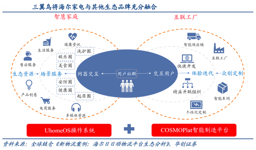經典案例:根據全球鏈倉《新物流案例:海爾日日順物流平臺生態分析》、華創證券等綜合資訊表明,三翼鳥生態以海爾家電為基礎不斷延伸拓展,將海爾各類家電產品與其他生態品牌充分融合,借助卡奧斯平臺賦能提高生產供應商效率,UhomeOS系統為智慧家庭提供操作接口,高端品牌卡薩帝提供套系產品,最終通過日日順物流的高效送裝實現場景生態落地。