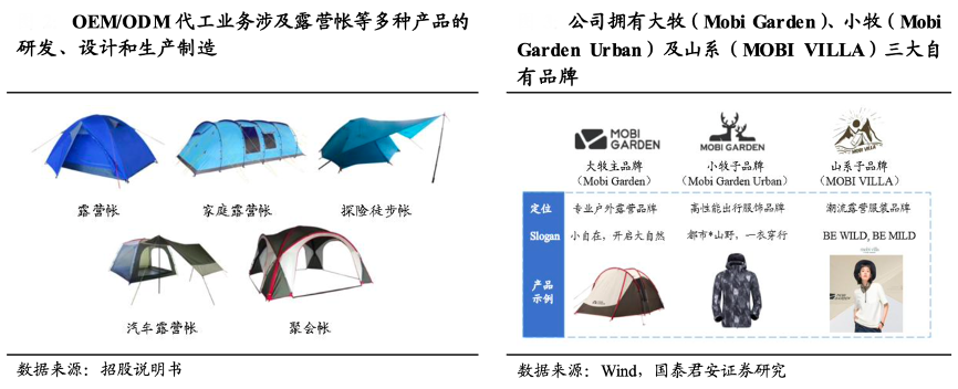 經典案例:根據招股說明書、wind、國泰君安證券研究等綜合資訊表明,自成立以來,牧高笛公司在OEM/ODM 代工業務的基礎上,大力發展自有品牌,陸續推出子品牌 Mobi Garden Urban 和山系輕機能露營服裝子品牌 MOBI VILLA,積極提倡國內消費者親近大自然,逐步鞏固在戶外露營領域的龍頭地位。