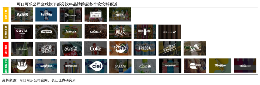 經典案例:根據可口可樂公司官網、長江證券研究所等綜合資訊表明,可口可樂公司除核心品牌可口可樂外,亦在全球擁有 200 個以上的飲料品牌,涉及果汁、乳制品、咖啡、茶飲、軟飲料、水、能量飲料七大賽道。在公司眾多的品牌中,可口可樂、雪碧、芬達、健怡可樂、可口可樂零度無糖占據全球六大無酒精氣泡軟飲料的五席。