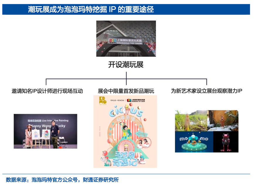經典案例:根據泡泡瑪特官方公眾號、財通證券研究所等綜合資訊表明,泡泡瑪特公司近年來開設北京潮玩展與上海潮玩展,邀請還未出名的設計師參展,幫助其定制一批產品并建立展臺。潮玩展每次持續 2 至 3 天,以2019 年 STS 上海國際潮流玩具展為例,時長 3 天的 STS 吸引 10 萬人次游客觀展。以觀展人次為基數,公司在展會期間觀察各個設計師展臺的客流量,篩選出吸引較多游客的展臺,并與設計師進行簽約。
