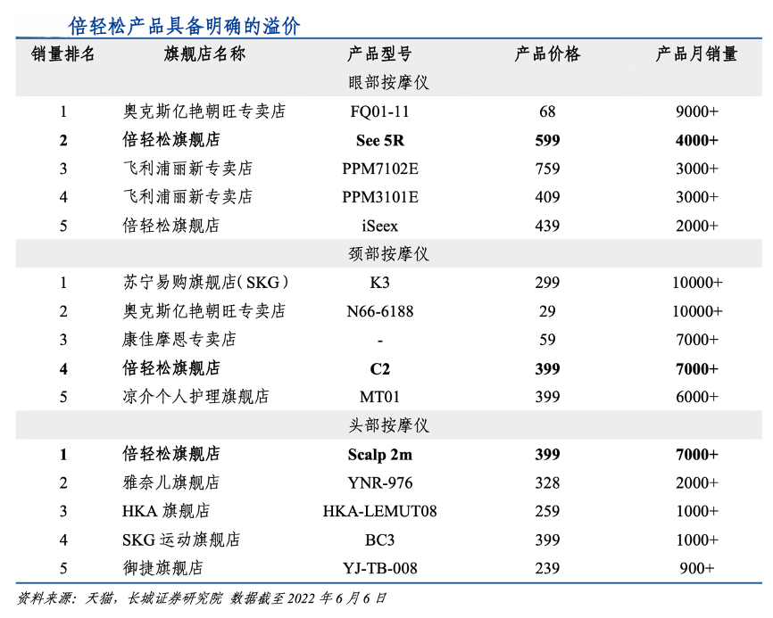 經(jīng)典案例:根據(jù)天貓、長(zhǎng)城證券研究院等綜合資訊表明,與同類目其他產(chǎn)品相比,倍輕松公司產(chǎn)品定價(jià)更高,產(chǎn)品價(jià)格普遍處于行業(yè)前列。以頸部按摩儀為例,銷量前五名的價(jià)格普遍在 500 元以下,而市場(chǎng)中產(chǎn)品的平均價(jià)位也在 200-300 元之間。