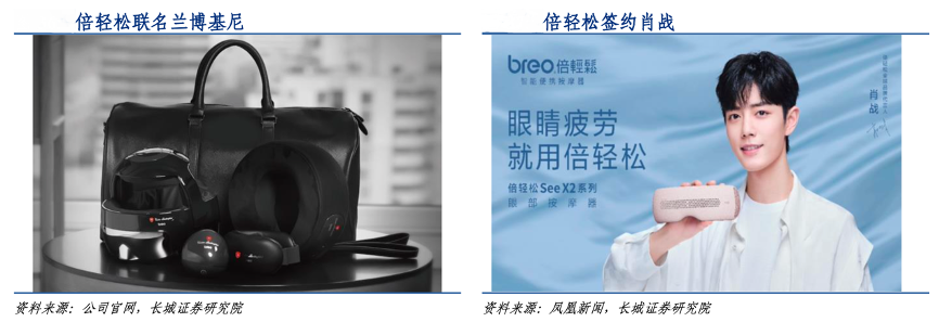 經(jīng)典案例:根據(jù)公司官網(wǎng)、鳳凰新聞、長城證券研究院等綜合資訊表明,2021 年 5 月 31 日,倍輕松公司宣布明星肖戰(zhàn)成為其首位全球品牌代言人,在微博、朋友圈、抖音多媒體組合曝光,第一條預告微博半小時內(nèi)點贊 破20 萬,官宣微博點贊量突破 215 萬。相關微博話題沖上熱搜,閱讀量突破 13 億。除 了曝光效果,倍輕松的點擊互動率達到行業(yè)均值的 10 倍之多。