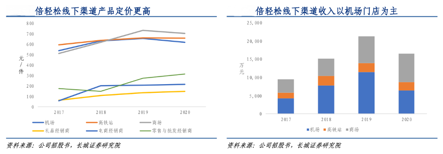 經(jīng)典案例:根據(jù)公司招股書、長城證券研究院等綜合資訊表明,倍輕松公司直營門店聚集于客流量較大的機場、高鐵站以及一二線城市核心商圈。截至 2021 年 6 月 30 日,公司商場門店覆蓋了全國 4 個一線城市、13 個新一線城市、16 個二線城市。高客流消費力匹配公司高端產(chǎn)品定價。2017-2020年公司直營門店價格普遍在 500-700 元,遠高于線上線下經(jīng)銷渠道 100-300 元的產(chǎn)品價格區(qū)間。