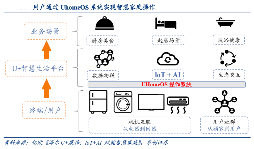經(jīng)典案例:根據(jù)億歐《海爾U+康偉:IOT+AI賦能智慧家庭》、華創(chuàng)證券等綜合資訊表明,UhomeOS 發(fā)布于2016 年,是海爾專為智慧家庭定制的生態(tài)操作系統(tǒng), 涵蓋臥室起居、廚房美食、浴室洗護(hù)等多個(gè)場(chǎng)景,可以通過(guò) UhomeOS 系統(tǒng)把用戶、家電、服務(wù)三者串聯(lián)起來(lái),提供全屋智能落地方案。