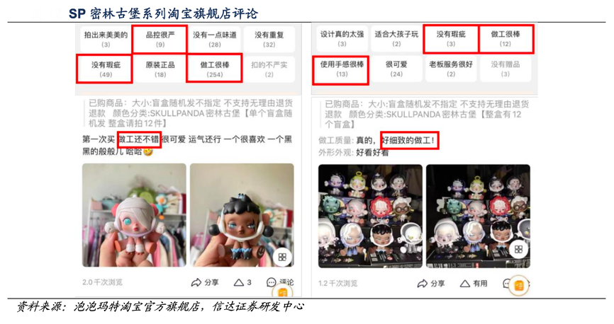 經典案例:根據泡泡瑪特淘寶官方旗艦店、信達證券研發中心等綜合資訊表明,泡泡瑪特產品由專門生產玩具的第三方制造商制造。截至 2020 年 12 月,公司與 18 家第三方制造商合作,負責制定標準營運程序及設計產品原型和模具,審慎甄選供應商并測試制造商生產的產品以確保產品質量。在公司淘寶官方旗艦店評論頁面發現,評論關鍵詞“品控很嚴”、“做工很棒”為較高頻詞匯,消費者對于產品質量較為滿意。