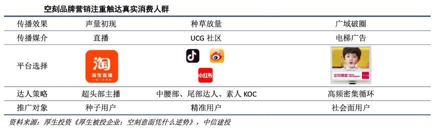 經(jīng)典案例:根據(jù)厚生投資《厚生被投企業(yè):空刻意面憑什么逆勢(shì)》、中信建投等綜合資訊表明,空刻通過梯媒進(jìn)一步靠近用戶消費(fèi)場(chǎng)景,傳遞“星級(jí)意面在家做”的品牌認(rèn)知,不斷觸達(dá)和覆蓋真實(shí)消費(fèi)人群。