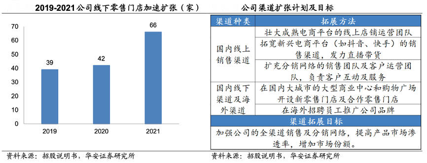 經(jīng)典案例:根據(jù)招股說明書、華安證券研究所等綜合資訊表明,作為 DTC 品牌,蕉下公司通過營銷完成品牌的出圈,其線下零售門店數(shù)由 2019 年末的 39 家 增加至 2021 年末的 66 家。在線下渠道加速擴張下,公司線下的營收逐漸增加,2019-2021年線下收入分別為 3.12/3.18/6.58 億,CAGR 達45.2%。