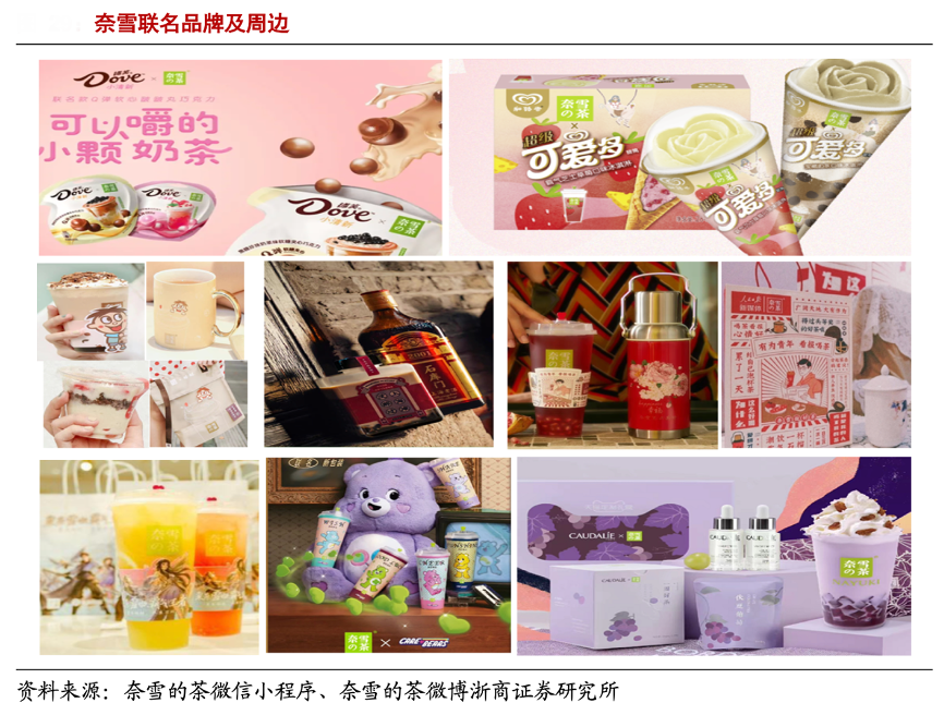 經典案例:根據奈雪的茶微信小程序、奈雪的茶微博、浙商證券研究所等綜合資訊表明,奈雪已與人民日報、王者榮耀、杯子美術館、亞朵、 旺旺等 30 家多行業多品牌進行聯名。例如 2019 年 9 月,奈雪的茶聯名人民日報新媒體開 展“有為青年看包喝茶”活動,開設線下快閃店還原“爺爺喝的茶”、“爸爸喝的茶”、“我 喝的茶”三個不同年代的喝茶場景。