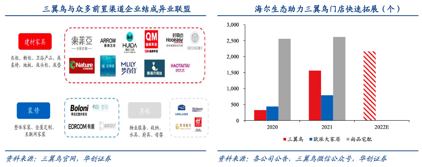 經典案例:根據三翼鳥官網、各公司公告、三翼鳥微信公眾號、華創證券等綜合資訊表明,三翼鳥成立伊始便依托海爾線下渠道迅 速成長,2021 年已累計建成 1563 家場景門店,超過歐派大家居門店。同時三翼鳥還積極整合家居、建材等前置渠道資源,與博洛尼、有屋等企業結成異業聯盟。