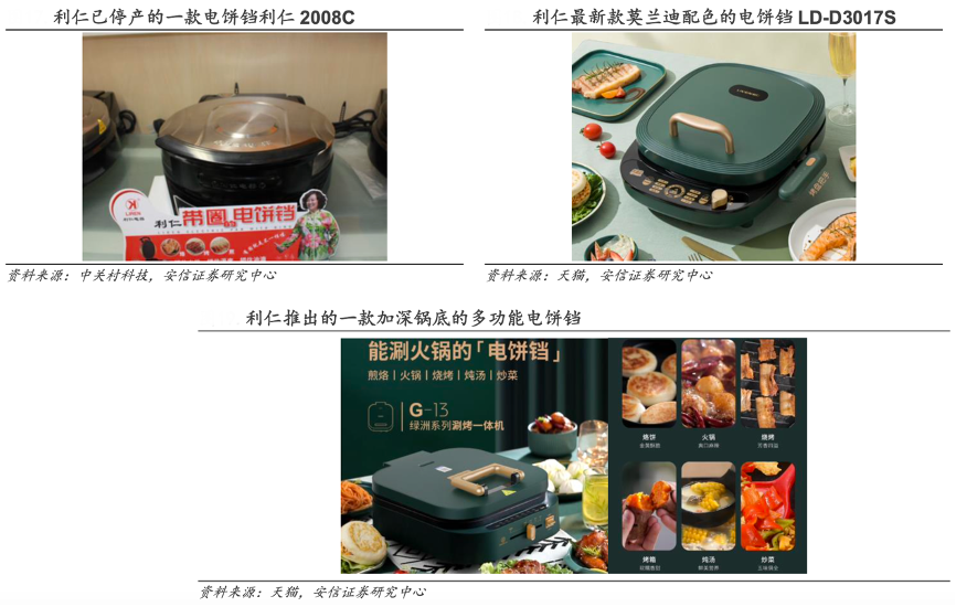 經典案例:根據中關村科技、天貓、安信證券研究中心等綜合資訊表明,電餅鐺早期主要定位于做餅的工具,利仁產品開始朝多功能的方向發展,制作的食物種類也開始多樣化。除了功能上的改進,電餅鐺的外觀設計上也逐漸趨向年輕化,部分產品顏色為更年輕時尚的莫蘭迪配色,和吸引年輕女性的萌系配色。