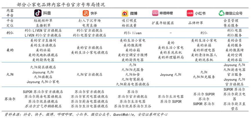 經典案例:根據抖音、快手、微博、嗶哩嗶哩、小紅書、微信公眾號、QuestMobile、安信證券研究中心等綜合資訊表明,家電品牌已入駐多個內容平臺,開展品牌運營和流量競爭。除了抖音以外,品牌在其它內容平臺也已建立了官方賬號,用以對不同類別的潛在客戶進行品牌推廣及售后服務等。為了進 一步提升品牌平臺流量,家電品牌也往往會和各類 KOL(關鍵意見領袖)進行合作,一般以直播帶貨(銷售分成)及明星代言(代言費)居多。