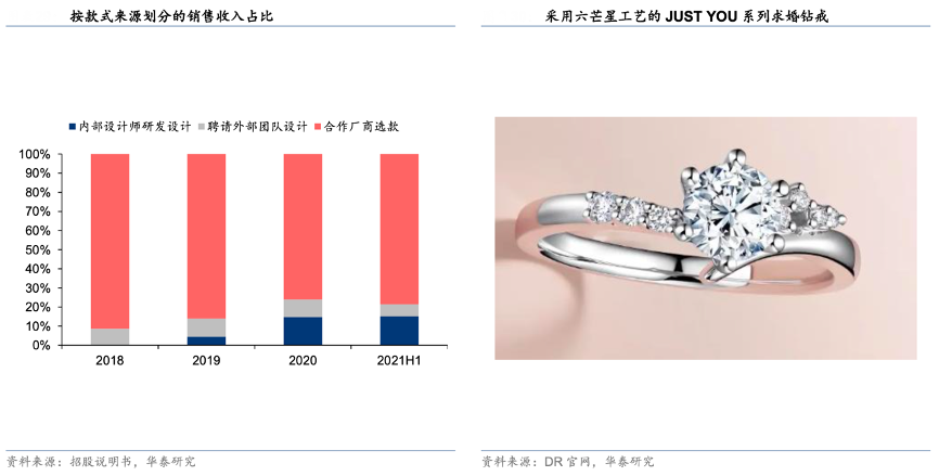 經(jīng)典案例:根據(jù)招股說明書、DR官網(wǎng)、華泰研究等綜合資訊表明,迪阿設(shè)計投入增加,并以獨家切割工藝提升產(chǎn)品力,例如暢銷款 JUST YOU 系列求婚鉆戒采用的“六芒星”切割工藝,可將鉆石切割出 99 面、使鉆石內(nèi)部呈現(xiàn)出獨特的六芒星圖案,凸顯產(chǎn)品美感。